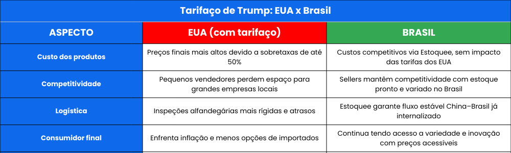 Entretanto, para o Brasil, o efeito é indireto. Sellers que compram com a Estoquee continuam aproveitando custos competitivos e variedade de produtos importados da China.