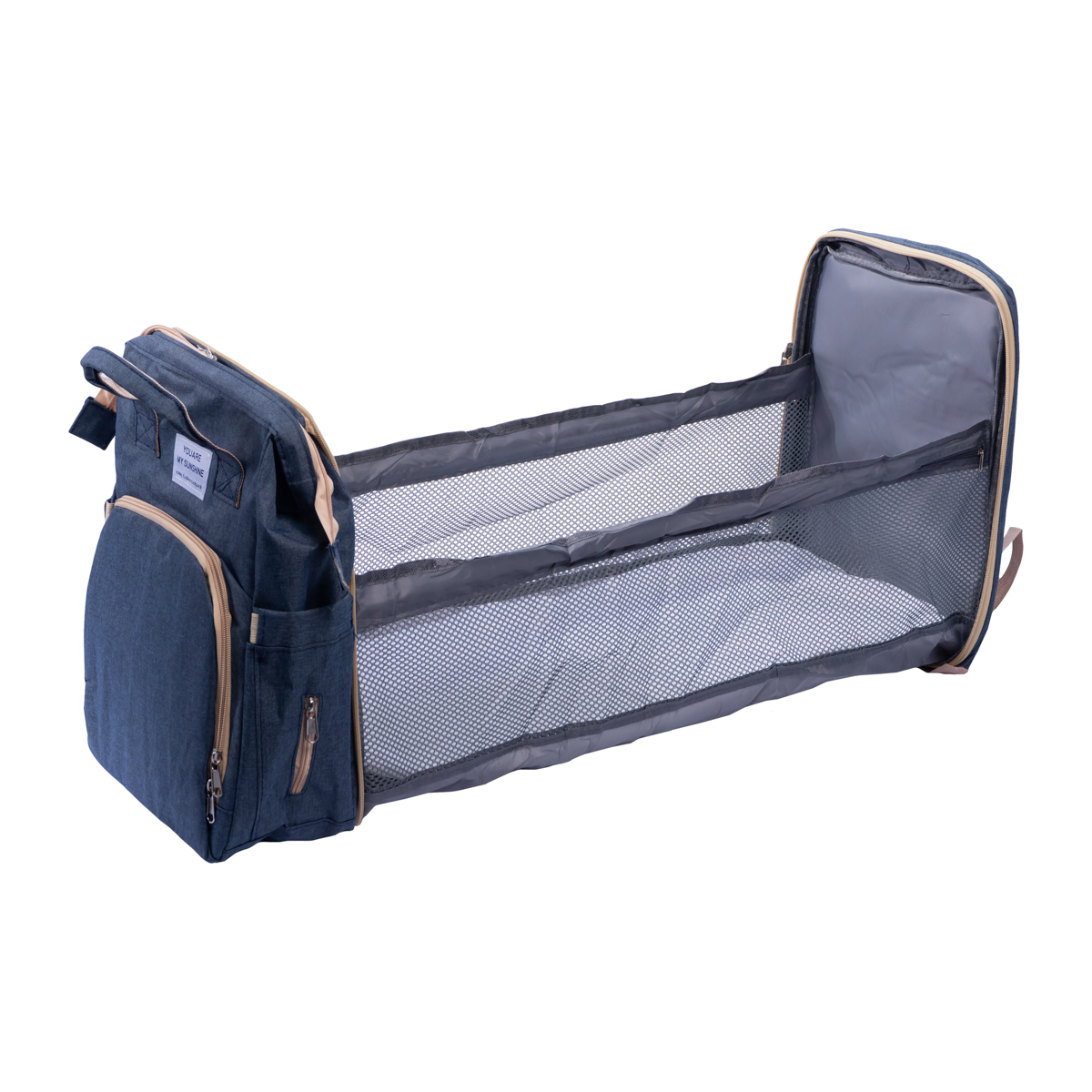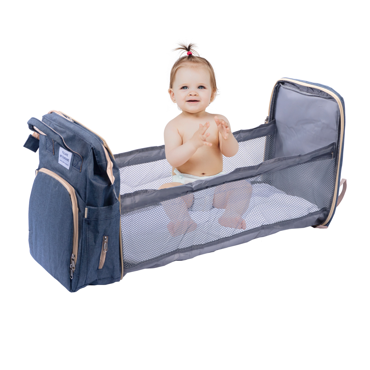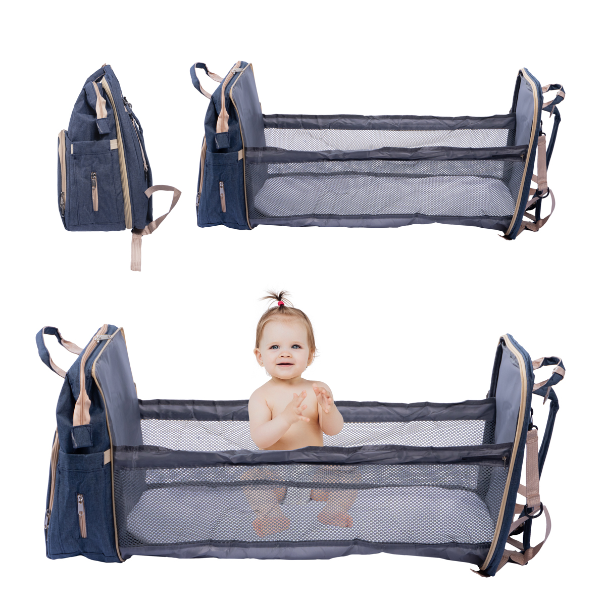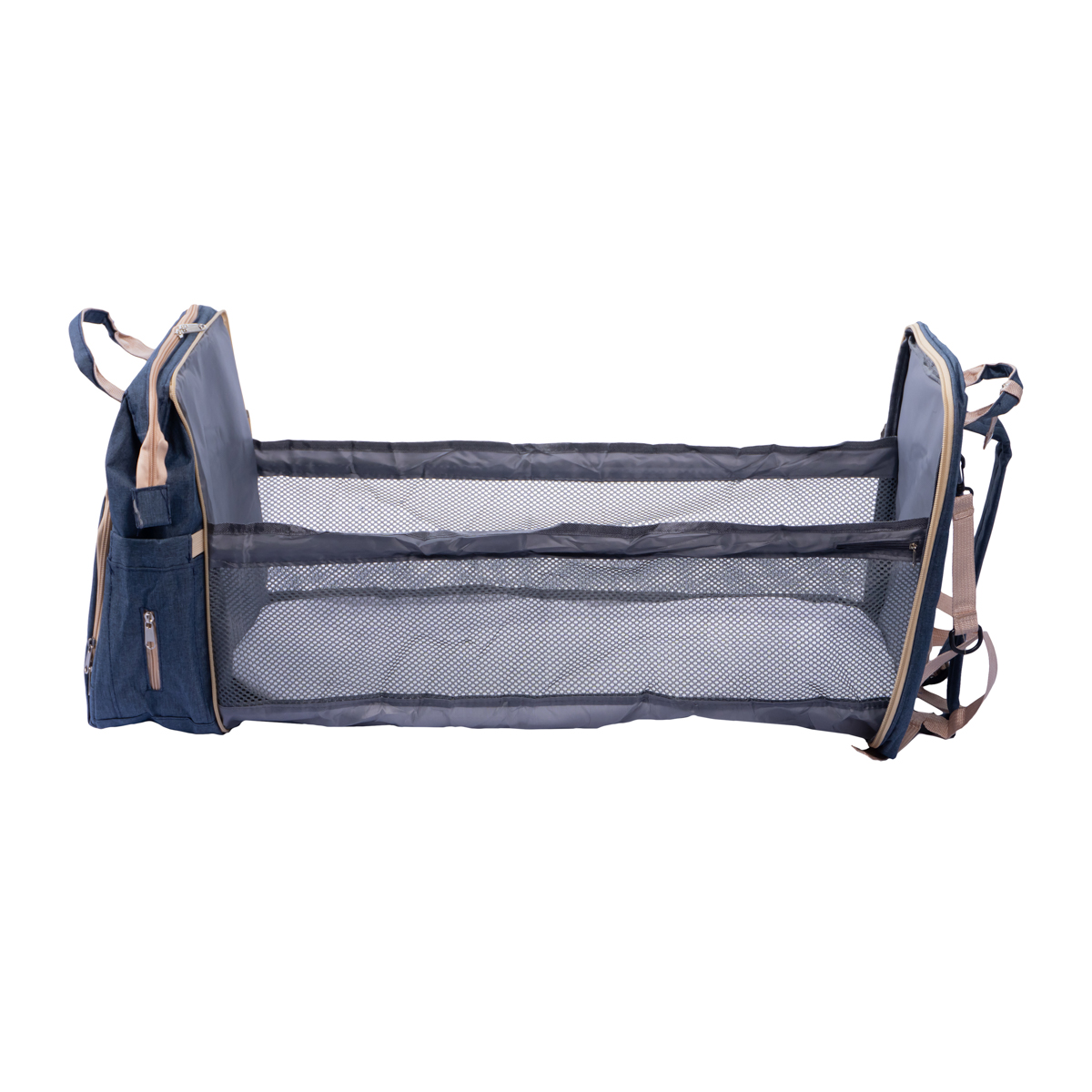 • Berço portátil integrado: 70 × 35 cm aberto e compacto quando dobrado