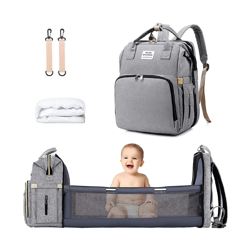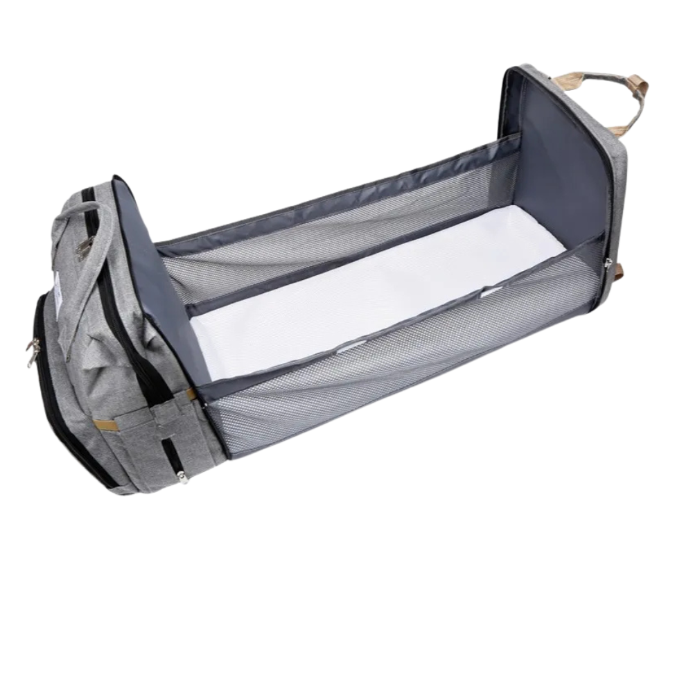 Mais do que uma bolsa, este modelo conta com uma cama dobrável integrada, perfeita para momentos em que o bebê precisa descansar fora de casa.